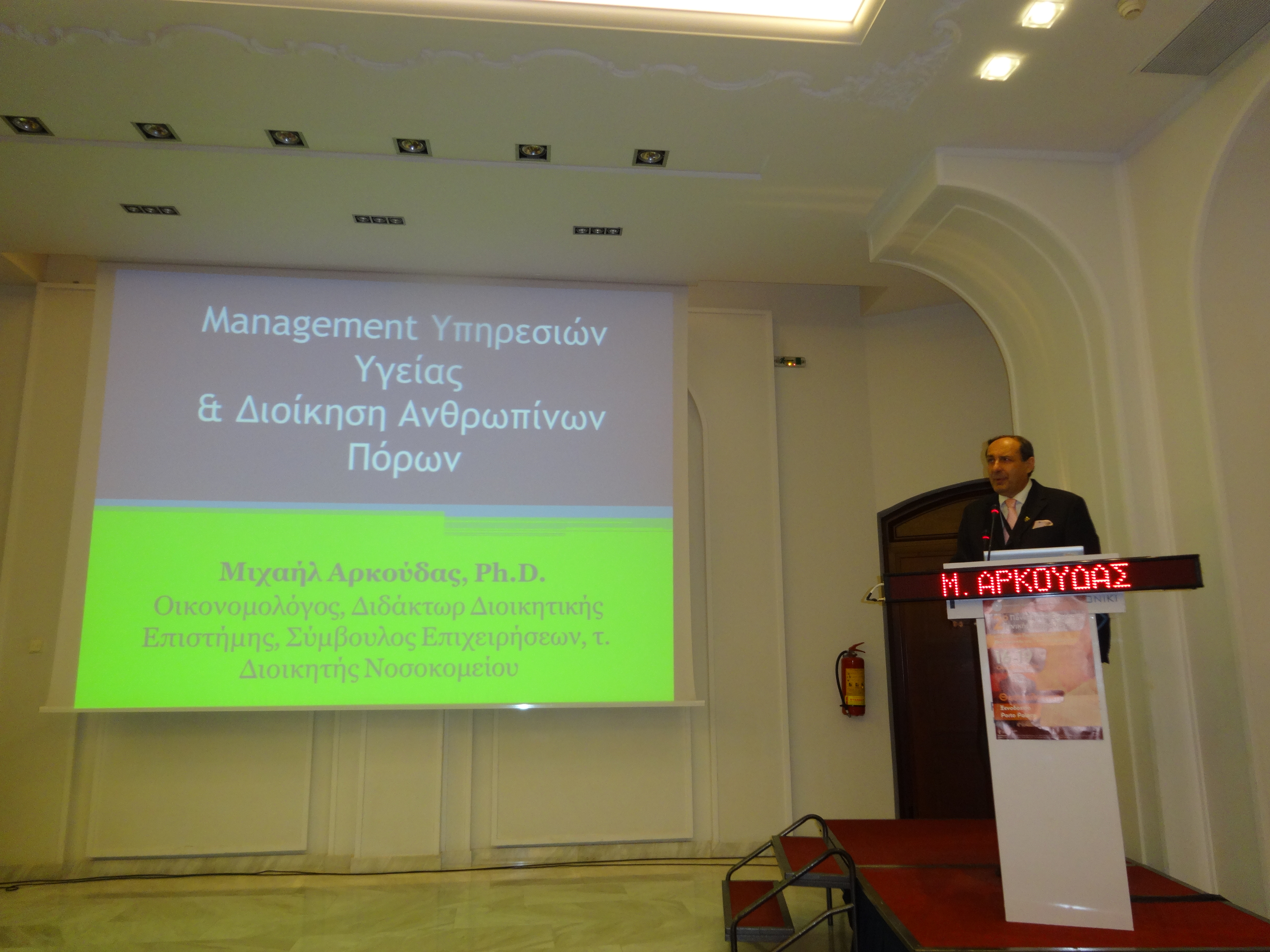 Το θέμα το οποίο ανέπτυξε ο κ. Μ. Αρκούδας είχε τίτλο: ‘‘Διαχείριση Υπηρεσιών Υγείας και διοίκηση ανθρώπινων πόρων’’.