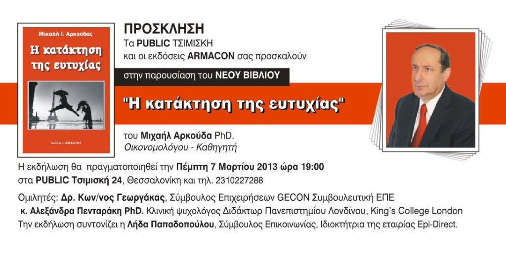 Παρουσίαση του νέου μου βιβλίου "Η ΚΑΤΑΚΤΗΣΗ ΤΗΣ ΕΥΤΥΧΙΑΣ", στο PUBLIC Τσιμισκή 24, Θεσσαλονίκη, ώρα 19:00 με ομιλητές τους Δρ. Κων/νο Γεωργάκα, Σύμβουλο Επιχειρήσεων GECON Συμβουλευτική ΕΠΕ και κα. Αλεξάνδρα Πενταράκη PhD. Κλινική ψυχολόγος Διδάκτωρ Πανεπιστημίου Λονδίνου, King's College London. Την εκδήλωση συντονίζει η Λήδα Παπαδοπούλου, Σύμβουλος Επικοινωνίας, ιδιοκτήτρια της εταιρίας Epi-Direct.